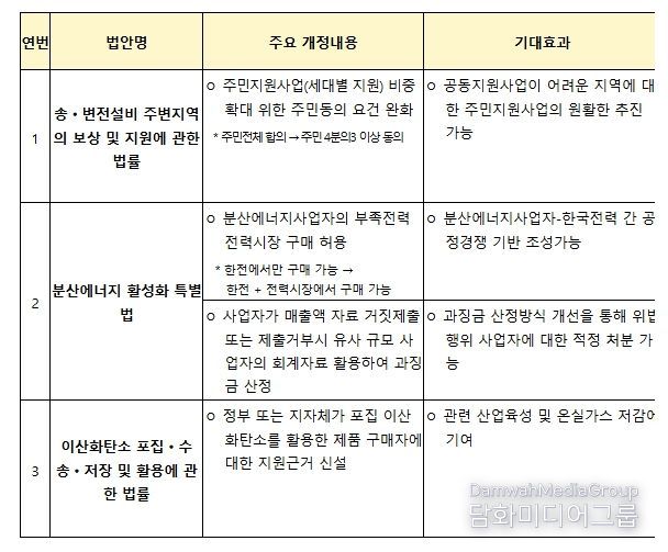 시민행정신문 강갑수 기자 | 기후에너지환경부는 △‘송‧변전설비 주변지역의 보상 및 지원에 관한 법률’, △‘분산에너지 활성화 특별법’ 등 3개 법 개정안이 11월 13일 국회 본회의를 통과했다고 밝혔다. 개정안별 주요내용은 다음과 같다.