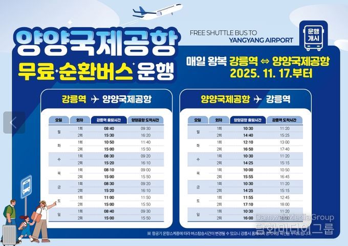 강릉역과 양양공항의 요일별 순환버스 탑승시간 및 승·하차장은 강릉시 홈페이지에서 확인 가능하며, 최근 양양국제공항 정기노선 취항을 시작한 파라타 항공의 출·도착 시간대에 맞추어 실질적인 환승 편의성을 높이는 방향으로 편성됐다.