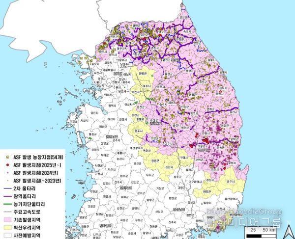 올해(2025년)는 신규지역으로 아프리카돼지열병이 확산되지 않고 기존 발생지역에서만 간헐적으로 발생하고 있다. 최근 춘천과 화천 등 접경지역에서 양성개체가 연이어 발생되고 있어, 이 지역을 중심으로 집중대책이 필요한 상황이다.