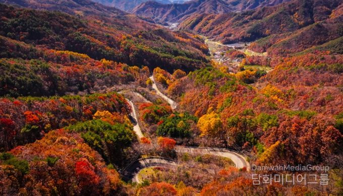 굽이마다 휘돌며 이어지는 길 위로 붉게 물든 숲이 드리워져, 한 폭의 수묵화처럼 운치를 자아낸다.