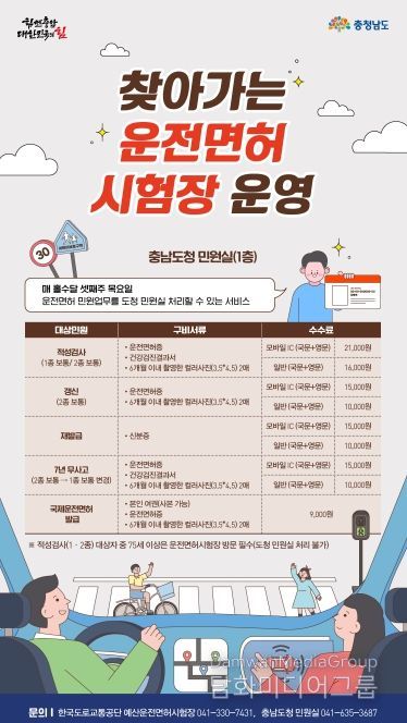 찾아가는 운전면허시험장은 한국도로교통공단 예산운전면허시험장과 협력해 운전면허 관련 민원 업무를 도청 민원실에서 직접 처리하는 서비스로, 내포신도시 인근 거주 도민들에게 큰 호응을 얻고 있다.