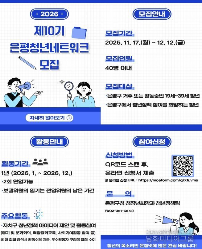 시민행정신문 강갑수 기자 | 서울 은평구는 청년과의 협력과 소통을 통해 이들의 다양한 목소리를 정책에 담기 위해 ‘은평구 청년네트워크 10기 위원’을 내달 12일까지 모집한다고 밝혔다.