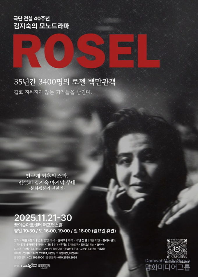시민행정신문 이존영 기자 | 극단 전설 40주년 기념작이자 배우 김지숙의 마지막 공연인 모노드라마 〈로젤〉이 오는 11월 21일부터 30일까지 꿈의숲아트센터 퍼포먼스홀에서 막을 올린다. 35년간 3,400회 이상 공연되며 백만 명이 넘는 관객을 울린 이 작품은 여성의 주체성과 인간성의 회복을 그린 한국 연극사의 대표작으로 꼽힌다.