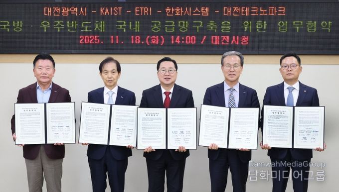 시민행정신문 이세훈 기자 | 대전시는 18일 시청에서 KAIST, 한국전자통신연구원(ETRI), 한화시스템, 대전테크노파크와 ‘국방·우주반도체 국내 공급망 구축을 위한 업무협약’을 체결했다.