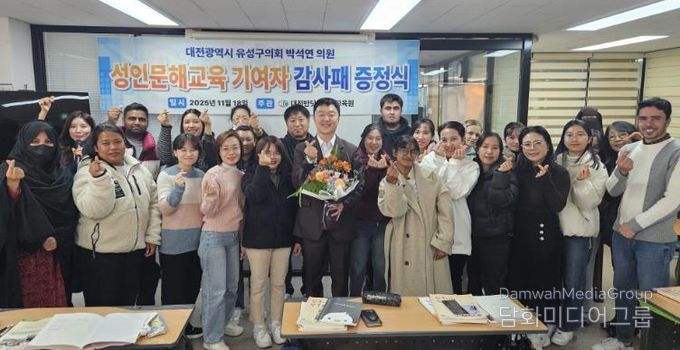 한편, 감사패 증정식은 대전반딧불평생교육원 성인문해교실에서 한글을 배우고 있는 비문해 성인 및 다문화 외국인들이 참석하여 함께 축하하는 자리를 가졌다.