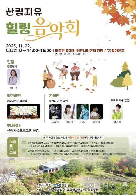 시민행정신문 기자 | 삼척시는 11월 22일 토요일 오후 2시부터 삼척활기 커뮤니티센터(미로면 준경길 530) 잔디광장에서 ‘산림치유 힐링 음악회’를 연다.