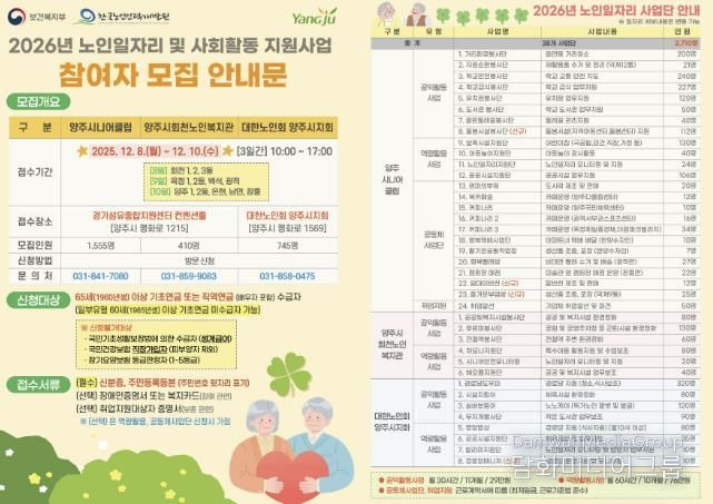 시민행정신문 강갑수 기자 | 양주시가 오는 12월 8일부터 10일까지 3일간 ‘2026년 노인일자리 및 사회활동 지원사업’ 참여자 2,710명을 모집한다.