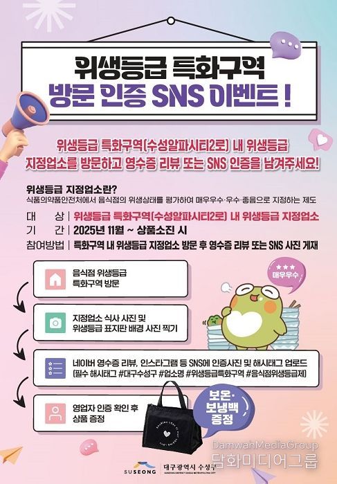 시민행정신문 강갑수 기자 | 대구 수성구는 ‘위생등급 특화구역 방문 인증 SNS 이벤트’를 실시한다고 밝혔다.