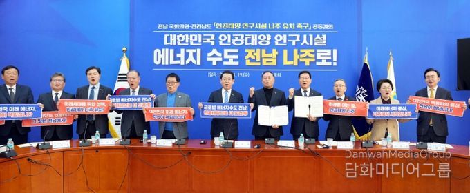 전남도는 이날 김영록 도지사, 김원이 민주당 전남도당위원장, 신정훈 국회 행정안전위원장, 박지원·이개호·조계원·김문수·권향엽 국회의원과 윤병태 나주시장 등이 참석한 가운데 국회 민주당 원내대표 회의실에서 ‘인공태양 연구시설 전남 나주 유치 전남 국회의원 공동결의문’을 발표했다. 오후에는 광주를 지역구로 둔 안도걸·전진숙·정준호 국회의원과 국회 소통관에서 공동결의문을 발표, 인공태양 연구시설 유치 노력에 힘을 실었다.