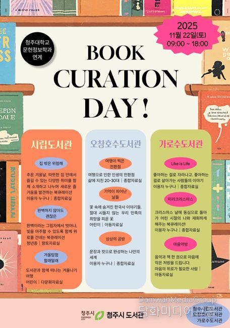 시민행정신문 기자 | 청주시립도서관은 청주대학교 문헌정보학과(지도교수 김혜영)와 함께 오는 22일 오전 9시부터 오후 6시까지 △시립도서관 △오창호수도서관 △가로수도서관 등 3개 도서관에서 ‘북큐레이션 데이’를 동시에 개최한다고 밝혔다.