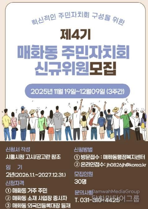시민행정신문 강갑수 기자 | 시흥시 매화동 행정복지센터는 12월 9일까지 ‘제4기 매화동 주민자치회’ 신규위원 30명을 공개 모집한다. 신청은 매화동 행정복지센터 방문 또는 전자우편을 통해 가능하다.