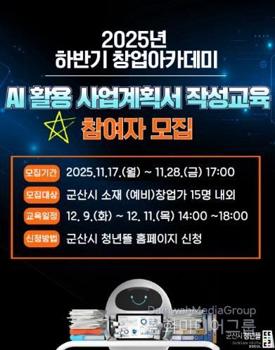 시민행정신문 강갑수 기자 | 군산시 청년뜰 창업센터는 28일까지 정부지원사업대비 사업계획서를 준비 중인 군산시 (예비)창업자를 대상으로 ‘2025년 하반기 창업아카데미 인공지능(AI) 활용 사업계획서 작성교육’ 참여자를 모집한다.