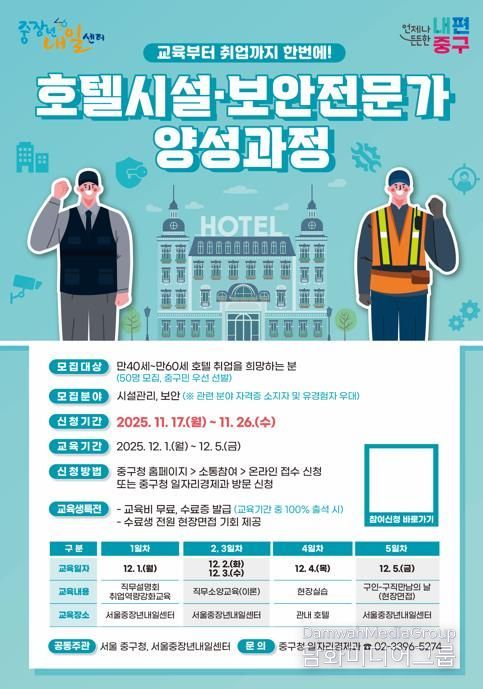 시민행정신문 강갑수 기자 | 서울 중구가 지역 중장년층의 취업 기회를 확대하고 호텔 산업의 인력수급 안정화를 지원하기 위해 노사발전재단 서울중장년내일센터와 함께 '호텔 시설·보안 전문가 양성과정'을 운영한다.