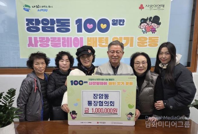 시민행정신문 강갑수 기자 | 의정부시 장암동주민센터는 11월 19일 장암동 통장협의회가 성금 100만 원을 전달하며 ‘100일간 사랑릴레이 배턴 잇기’에 힘을 보탰다고 밝혔다.