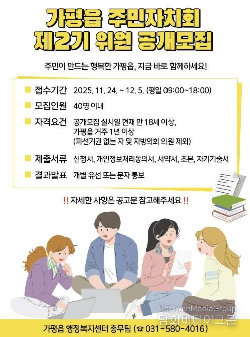 접수는 11월 24일부터 12월 5일까지 12일간이며, 가평읍 행정복지센터 총무팀에 신청하면 된다. 모집 인원은 40명 이내이며, 신청 자격은 공개모집 공고일(11월 11일) 기준 만 18세 이상이면서 가평읍에 1년 이상 거주한 주민이다. 다만 '공직선거법' 제19조에 따라 피선거권이 없는 주민과 지방의회 의원은 신청 대상에서 제외된다.