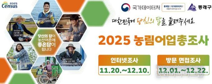 시민행정신문 강갑수 기자 | 부산 동래구는 11월 20일부터 12월 22일까지 33일간 ‘2025 농림어업총조사’를 실시한다고 밝혔다.