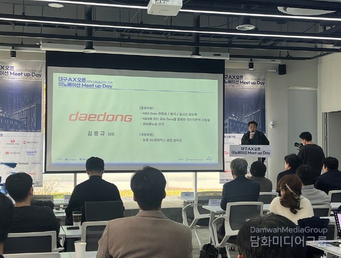 본격 밋업에 앞서 대홍코스텍 김기환 대표가 ‘대구·경북 중소기업의 AX 현황’을 주제로 기조 강연을 진행했고, 선도기업과 스타트업 간 협업 가능한 과제를 소개하는 기업 리버스 피칭이 이어졌다.