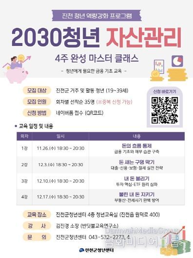 시민행정신문 강갑수 기자 | 충북 진천군 청년센터는 지역 청년들의 안정적인 자산 형성과 금융 역량 강화를 위해 ‘청년 자산관리 4주 완성 마스터 클래스’를 운영한다고 20일 밝혔다.