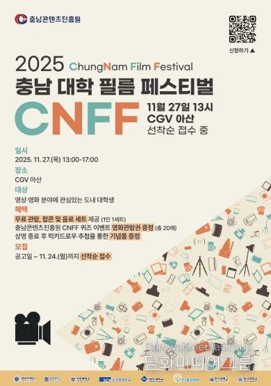 시민행정신문 기자 | 충남콘텐츠진흥원이 창립 20주년을 맞아, 오는 27일 CGV 아산에서 ‘충남 대학 필름 페스티벌(CNFF)’을 개최한다고 밝혔다.
