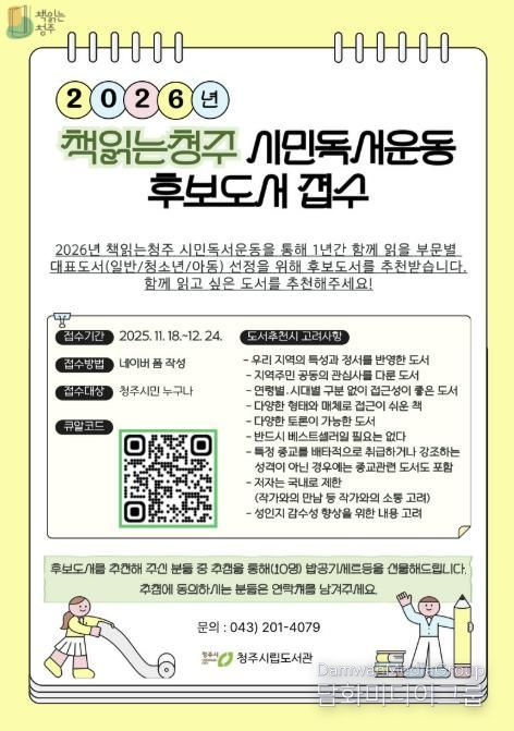 시민행정신문 강갑수 기자 | 청주시립도서관은 시민 독서운동 ‘책읽는청주’의 2026년도 대표도서 선정을 위해 오는 12월 24일까지 시민 추천을 접수한다고 21일 밝혔다.
