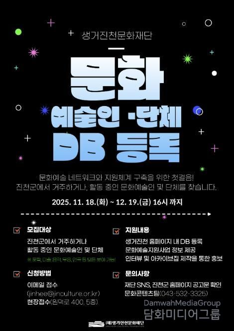 시민행정신문 강갑수 기자 | 충북 진천군 생거진천 문화재단은 진천군 문화예술인·단체 데이터베이스(DB) 구축을 위해 오는 12월 19일까지 등록 신청을 받는다고 21일 밝혔다.