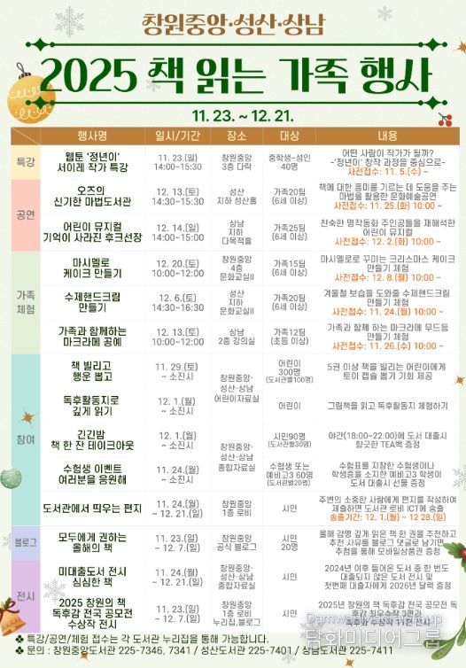 대표 행사로는 ▲웹툰 ‘정년이’의 서이레 작가 특강(창원중앙) ▲마술공연 ‘오즈의 신기한 마법도서관’(성산) ▲어린이 뮤지컬 ‘기억이 사라진 후크선장’(상남)을 운영한다.