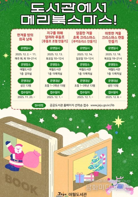 시민행정신문 기자 | 제주시 애월도서관은 겨울을 맞아 지역 주민들이 따뜻하고 풍요로운 연말을 보낼 수 있도록 12월 2일부터 18일까지 ‘도서관에서 메리북스마스!’ 연말 특별 프로그램을 운영한다.
