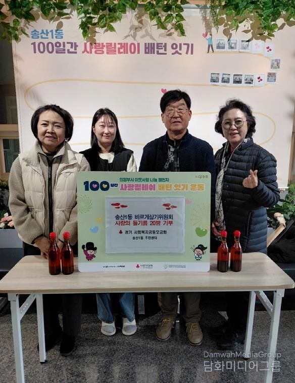 시민행정신문 강갑수 기자 | 의정부시 송산1동주민센터는 11월 19일 송산1동 바르게살기위원회가 직접 만든 들기름 20병을 기부하며 ‘100일간 사랑릴레이 배턴 잇기’에 동참했다고 밝혔다.