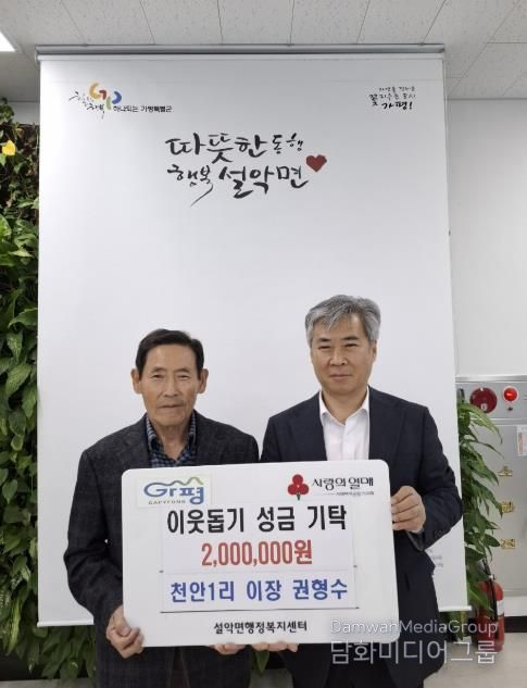 이동철 설악면장은 “권형수 이장님은 매년 취약계층을 위해 성금을 기탁하며 지역 나눔 문화를 확산하는 데 큰 역할을 하고 있다”며 “전해주신 성금은 꼭 필요한 분들께 소중히 전달하겠다”고 밝혔다.