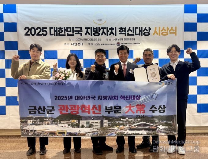 시민행정신문 강갑수 기자 | 금산군은 20일 서울시 강남구 논현동 건설회관에서 열린 2025 대한민국 지방자치 혁신대상 시상식에서 관광혁신부문 대상을 받았다.