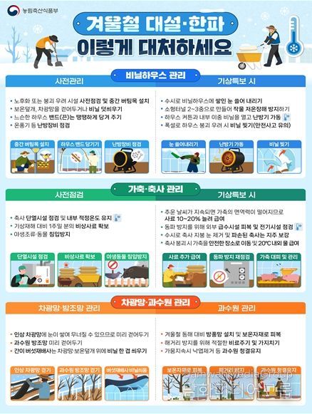 도는 겨울철 농업재해 상황실을 내년 3월15일까지 운영해 기상특보 전파, 피해 상황 파악, 응급복구 지원 등 종합 상황관리를 수행한다. 경보 발령 시에는 초동대응팀·재해복구팀·축산팀이 비상체체로 돌입해 24시간 대응체계를 유지한다. 시군·기상청·유관기관 등과의 공조체계를 통해 사전대응요령과 농업인 안전 등을 상시 홍보하고, 정보 공유를 강화한다.