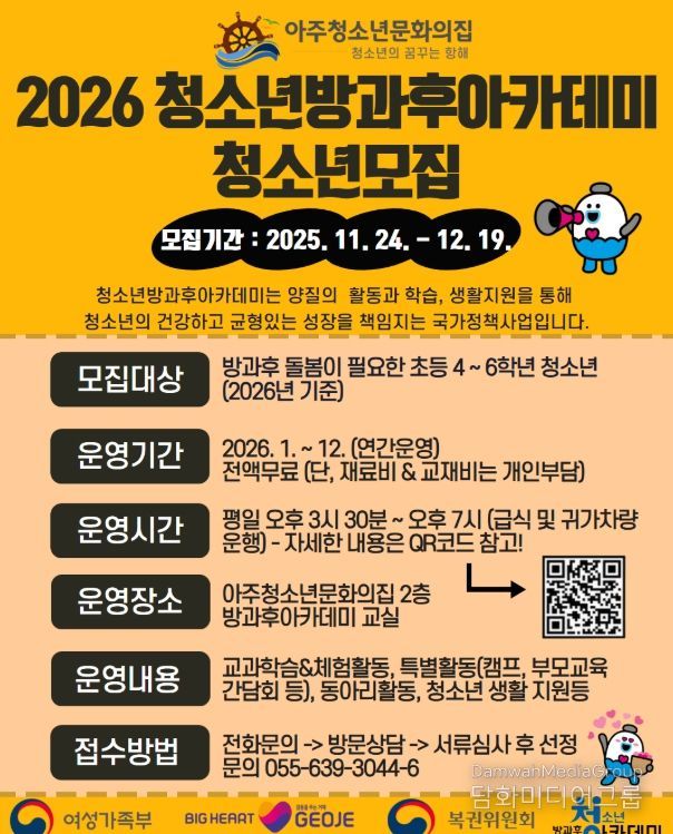 모집대상은 2026년 기준 초등학교 4~6학년으로, 아주 및 인근 지역에 거주하는 방과 후 돌봄이 필요한 청소년은 누구나 신청할 수 있다.