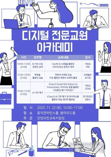 시민행정신문 기자 | 경기도안양과천교육지원청은 11월 22일, 디지털 역량을 체계적으로 강화하기 위한 디지털 전문교원 아카데미 연수를 운영했다. 이번 전문과정에는 관내 초등 교원 30명이 참여해 AI 기반 수업 콘텐츠 설계, 챗봇을 활용한 실습, AI기반 평가, 디지털 문해력 기반 수업 혁신 전략 등 심화 전문 영역을 학습했다.