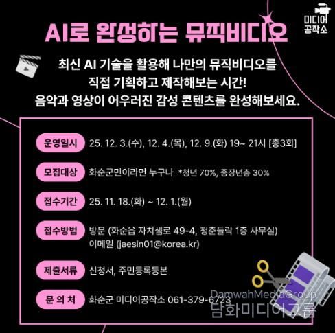 시민행정신문 강갑수 기자 | 화순군은 오는 12월 3일부터 화순군민을 대상으로 화순군 청년센터(청춘들락) 미디어공작소에서 ‘AI로 완성하는 뮤직비디오 영상 제작하기’ 교육을 진행한다고 밝혔다.