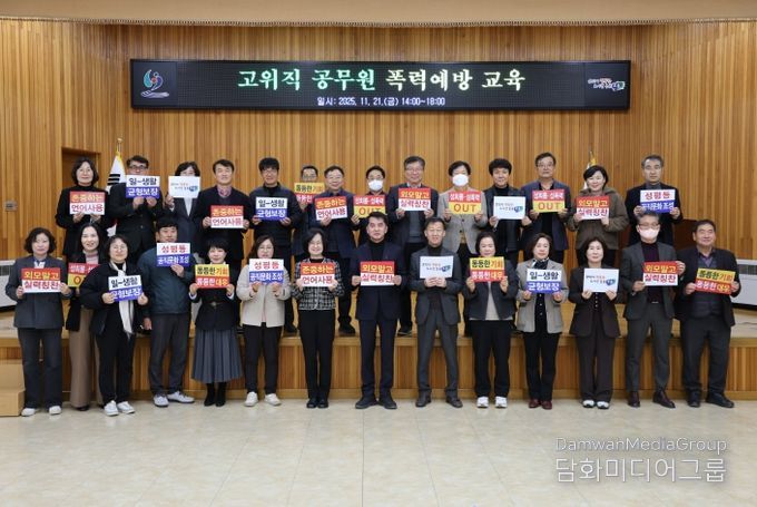 이번 교육은 ‘고위직 대상 별도 4대 폭력예방 교육 의무화’에 따라 양성평등 의식을 제고하고 건전한 공직문화를 조성하기 위해 마련된 것으로, 한국서비스교육원 김춘애 원장을 초빙해 △관리자의 책임과 의무 △성인지 기반의 폭력 예방 인식 강화 △성평등한 조직문화 조성 전략 등을 중심으로 4시간 동안 진행됐다.