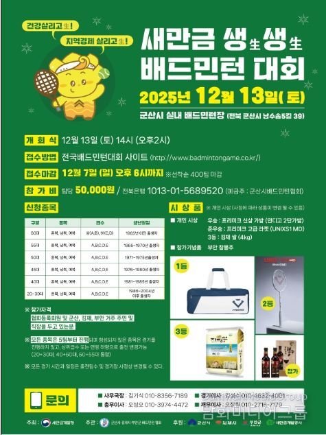 시민행정신문 장규호 기자 | 새만금개발청은 오는 12월 13일 군산 실내배드민턴장에서 새만금 지역 주민의 건강을 살리고(生), 경제도 살린다(生)는 의미로 ‘새만금 생生생生배드민턴대회’를 개최한다.