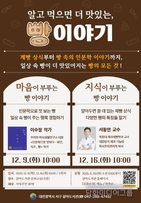시민행정신문 강갑수 기자 | 대전 서구 갈마도서관은 ‘알고 먹으면 더 맛있는 빵 이야기’ 강좌를 운영한다고 24일 전했다.