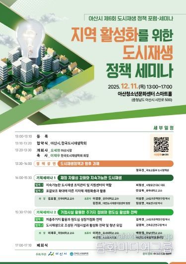 한편, 세미나는 누구나 참여할 수 있으며 자세한 내용은 아산시 도시재생지원센터 블로그 및 페이스북을 통해 확인할 수 있다. 신청은 전화, 포스터 QR코드, 방문 접수를 통해 가능하다. 시는 ‘2025~2026 충남·아산 방문의 해’를 맞아 시민들의 많은 참여와 관심 바란다고 밝혔다.