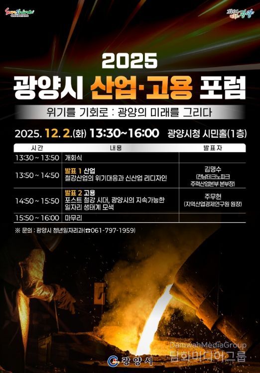 시민행정신문 이세훈 기자 | 광양시는 오는 12월 2일 오후 1시 30분, 시청 시민홀에서 ‘2025 광양시 산업・고용 포럼’을 개최한다고 밝혔다.