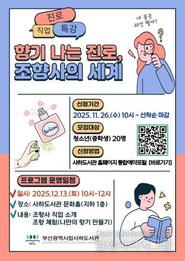 김정남 사하도서관장은 “조향은 감성과 과학이 조화를 이루는 창의적 직업”이라며 “이번 특강이 학생들이 자신의 진로를 폭넓게 탐색하고 새로운 가능성을 발견하는 기회가 되길 바란다”고 말했다.