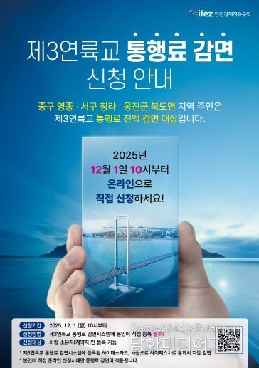 시민행정신문 강갑수 기자 | 인천경제청은 2026년 1월 개통 예정인 제3연륙교의 영종·청라·북도면 지역 주민 통행료 감면을 위한 온라인 사전 신청을 오는 12월 1일 10시부터 시작한다고 밝혔다.