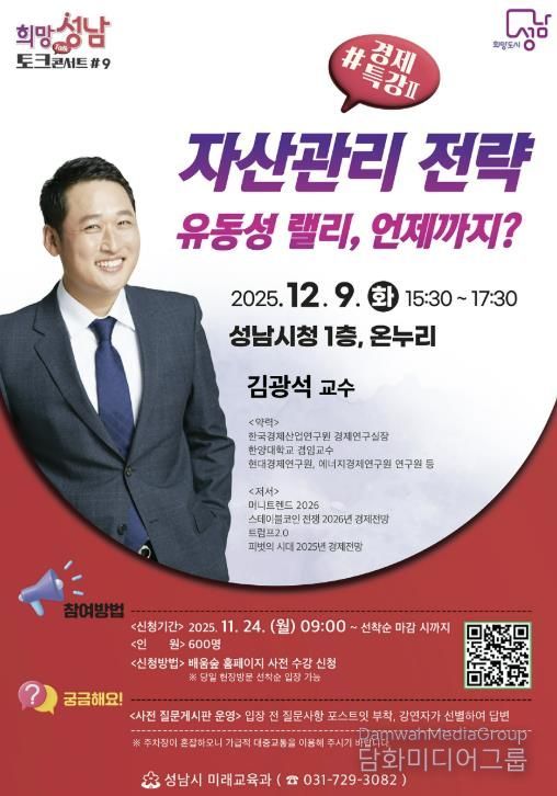 시민행정신문 강갑수 기자 | 성남시는 오는 12월 9일 오후 3시 30분~5시 30분 시청 1층 온누리에서 ‘자산관리 전략’을 주제로 한 올해 희망성남 토크콘서트 마지막 강연을 연다.