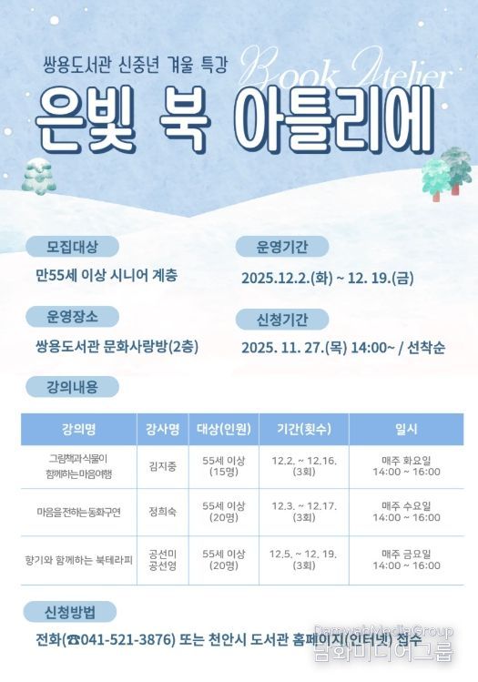 시민행정신문 강갑수 기자 | 천안시 쌍용도서관은 내달 신중년과 함께하는 겨울 특강 ‘은빛 북 아틀리에’를 운영한다고 26일 밝혔다.