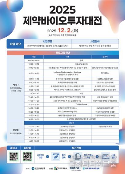 시민행정신문 이세훈 기자 | 인천광역시가 주최하고 인천관광공사와 KOTRA, 한국제약바이오협회가 공동 주관하는 ‘제약바이오투자대전’이 오는 12월 2일 인천 송도컨벤시아 프리미어볼룸에서 열린다.