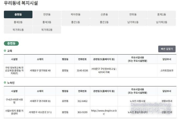 ◯ 구는 또한 홈페이지(분야별 정보 → 복지 → 복지시설 현황 → 우리동네 복지시설)에 관내 복지시설을 14개 동별·분야별로 일목요연하게 정리해 놓았다.