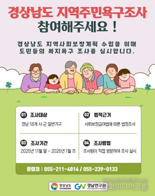 이번 조사는 경남연구원에서 실시하며, 조사 결과는 내년 경상남도 및 18개 시군의 ‘제6기 지역사회보장계획(2027~2030)’ 수립을 위한 기초자료로 활용된다.