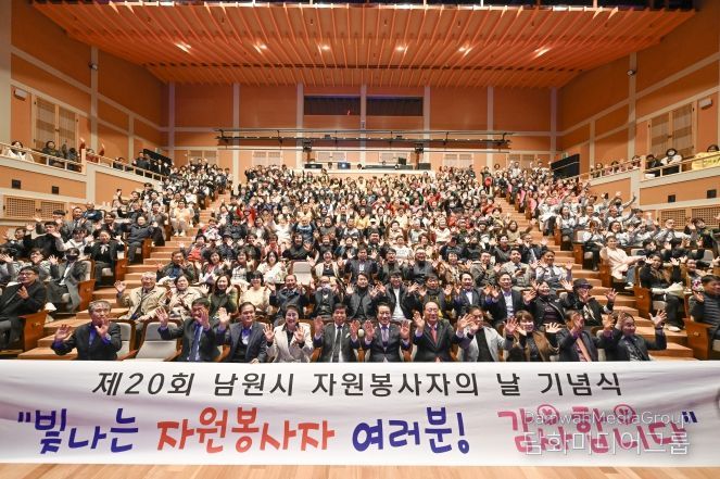 시민행정신문 강갑수 기자 | 남원시는 지난 26일 청아원에서 자원봉사자들의 노고를 격려하고 화합을 다지는 ‘제20회 남원시 자원봉사자의 날 기념식’을 개최했다. 약300여명의 자원봉사자가 함께한 이번 행사는 다가오는 ‘세계 자원봉사자의 날(12월 5일)’을 앞두고 그간의 봉사활동에 대한 감사의 마음을 전하기 위해 마련됐다.