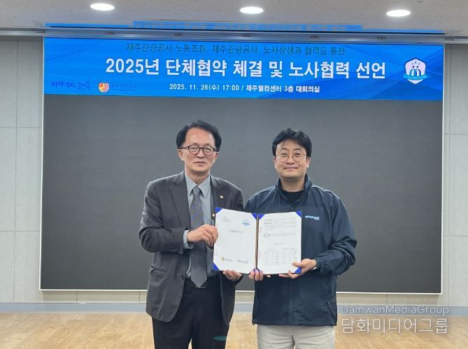 시민행정신문 강갑수 기자 | 제주관광공사(사장 고승철)와 제주관광공사 노동조합(위원장 김성훈)은 지난 26일 제주웰컴센터에서 2025년 단체협약을 원만히 타결, 2회 연속 무분규·무쟁의 방식으로 평화적 협약을 체결했다고 27일 밝혔다.