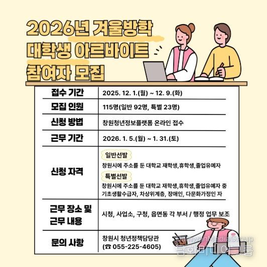 시민행정신문 이세훈 기자 | 창원특례시는 대학생들에게 공공분야 일 경험 기회를 제공하기 위해 겨울방학 대학생 아르바이트 참여자를 12월 1일부터 9일까지 115명(일반선발 92명, 특별선발 23명) 모집할 계획이라고 밝혔다.