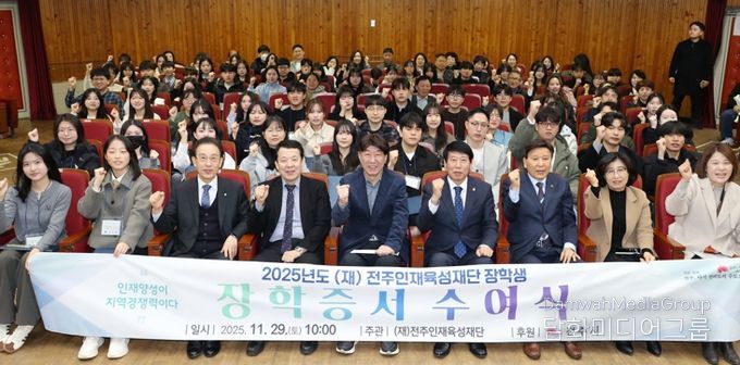 전주인재육성재단은 29일 전주시청 강당에서 ‘2025년도 2학기 (재)전주인재육성재단 장학생 장학증서 수여식’을 개최하고, 장학생으로 선발된 70명의 학생에게 장학증서를 수여했다.